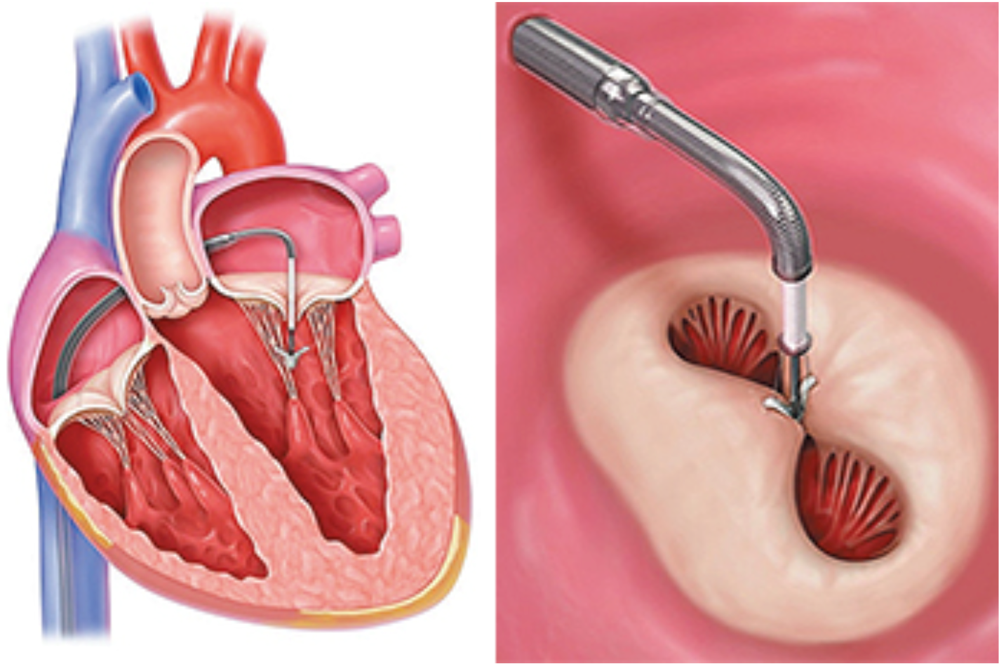 MitraClip(カテーテルでの僧帽弁閉鎖不全症に対しての治療)は、心不全の原因となる僧帽弁閉鎖不全症に対し、足の付け根の血管から心臓内へカテーテルを挿入し、クリップ(約15㎜大)を運び、適切に閉じない僧帽弁をクリップでつまむことで、逆流を制御するという治療です。