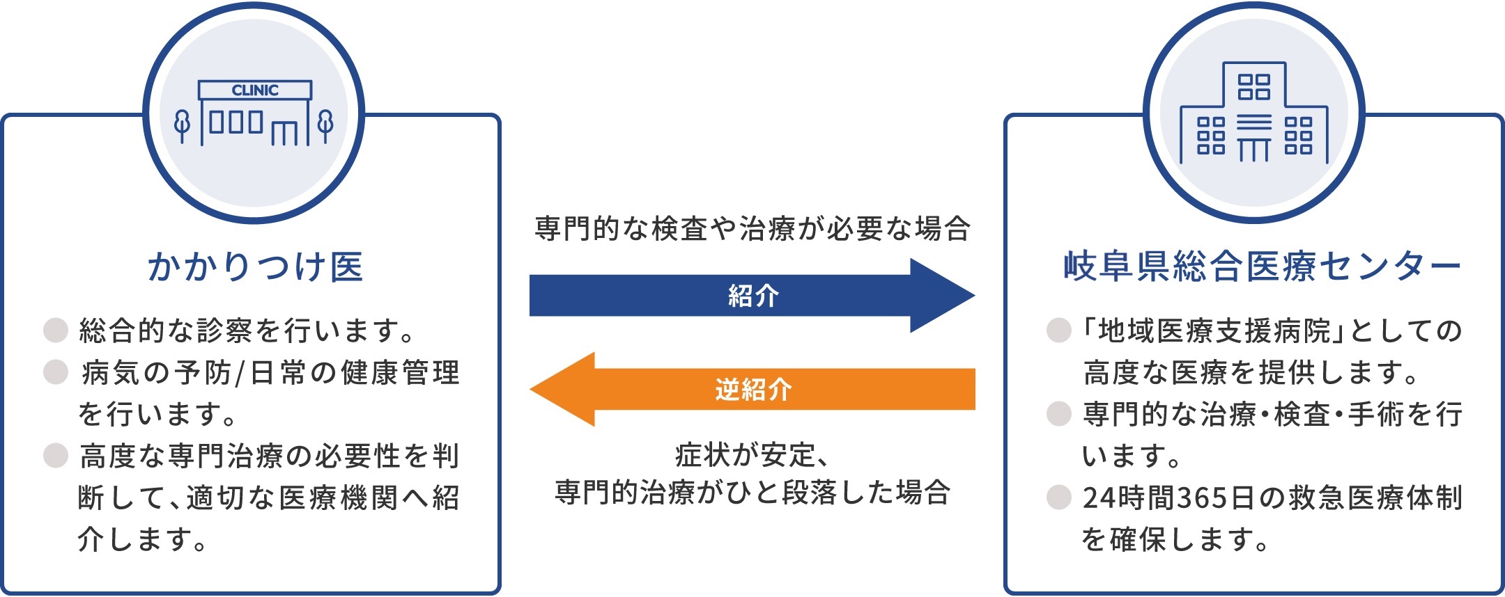 当センターは、岐阜県の中核を担う病院として、患者さんの「かかりつけ医」からの紹介を受けて、幅広い診療科への外来受診、入院診療、高精度な医療機器・設備での検査等を受け入れています。